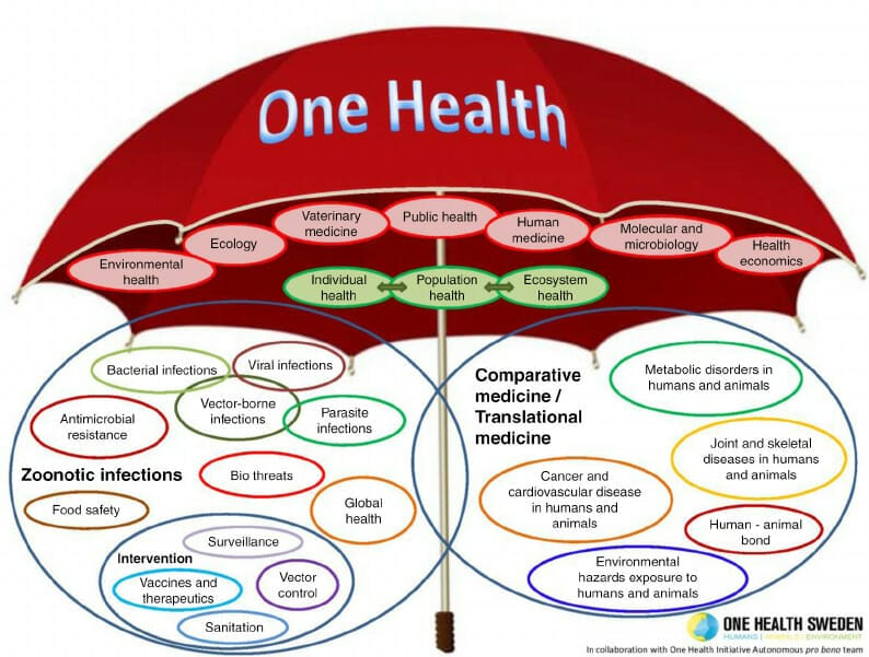 Perhaps the single graphic that best expresses what One Health is all about was created in December 2013 and early 2014 by ONE HEALTH SWEDEN in collaboration with the One Health Initiative Autonomous pro bono team*: