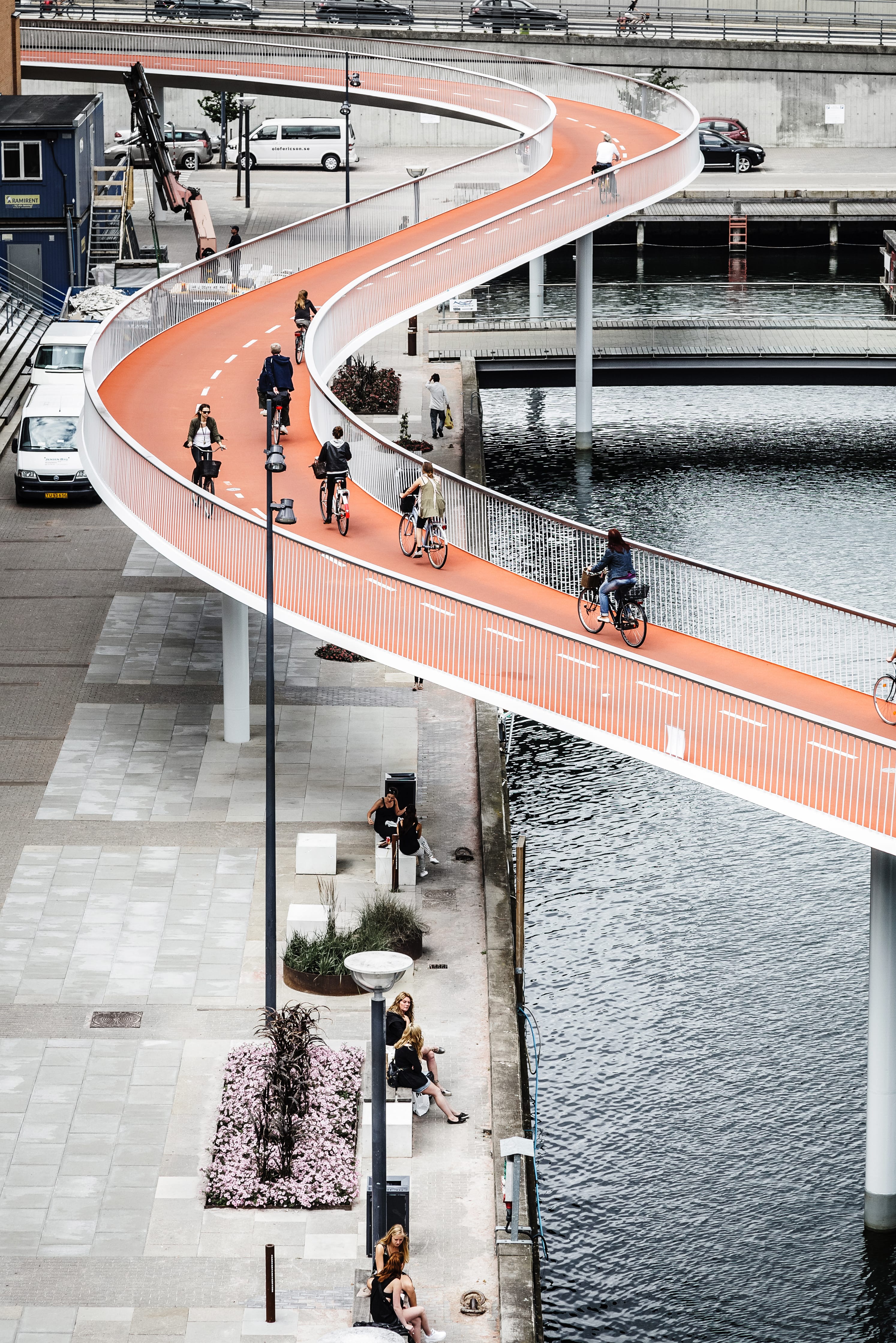 In the Photo: The Bicycle Snake – an elevated bicycle lane to make a short-cut through the city. Photo Credit: Rasmus Hjortshøj