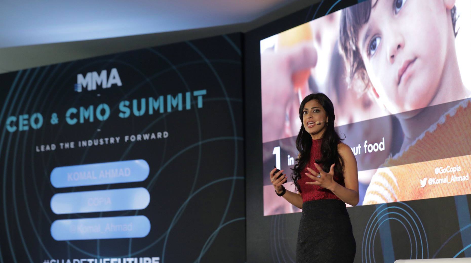 In the Photo: “So many before us, perhaps even a few of us in this room, have said eradicating hunger and reducing food waste is impossible…The impossible does not exist. And it can no longer exist. Especially not when we waste 3 times more food than there are hungry mouths to feed,” Komal Ahmad, CEO and Founder of Copia, speaking at the Mobile Marketing Association CEO & CMO Summit. Photo Credit: Copia
