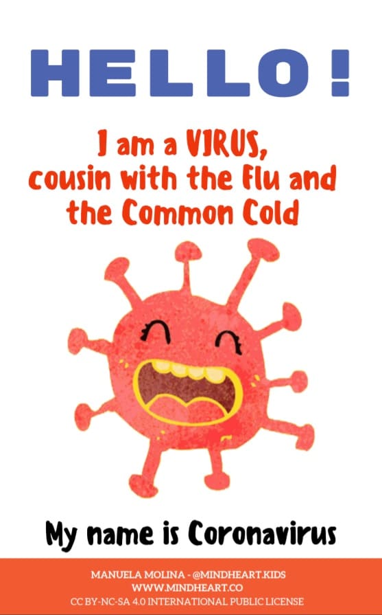 COVIBOOK, a short book with a simple, catchy title created for children under the age of 7 is freely available in many languages (from English, Spanish and French to Russian, Chinese and Arabic) on Mindheart’s website (click here). I wasn’t able to check all those languages but for the three I know (English, Spanish and French), the text is adequately translated.