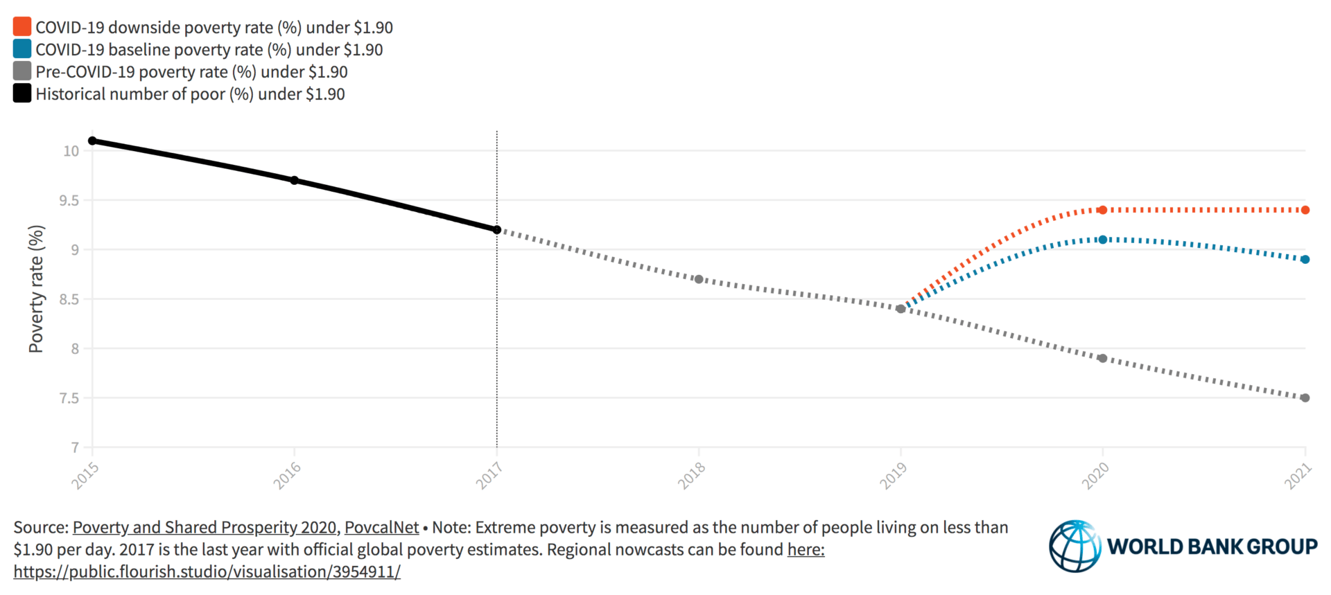 Instead, the World Bank’s report “Poverty and Shared Prosperity 2020: Reversals of Fortune” now estimates that the rate will rise to 9.1-9.4% in 2020 and that it would be about 7% in 2030 (which the report notes is an optimistic projection).