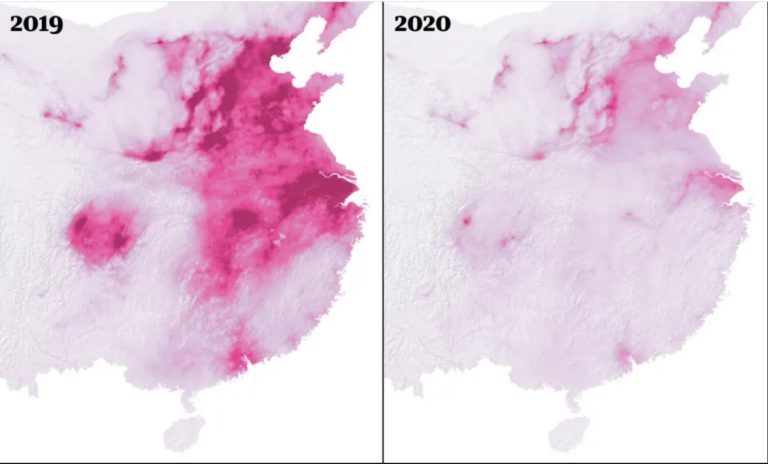 Pollution levels in China in 2019, left, and 2020. Photograph: Guardian Visuals / ESA satellite data