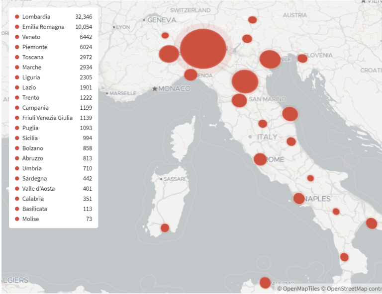 The above map clearly shows where the peak areas are, all in cities and industrial areas. By region, the only ones that escape the worst are those with famously clean air and relatively little industrial activity: Valle d’Aosta, Calabria, Basilicata, and Molise. Surprisingly perhaps, Sicily suffers from a high rate of contagion, but that is due to its two major industrial cities: Palermo and Catania (the latter not shown on this map).