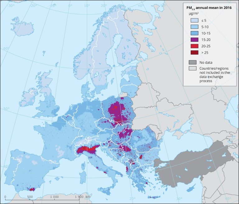 If you look at the map of the EEA on the average concentration value of PM2.5 which shows areas that are particularly polluted (in red and deep purple), the situation of the Po valley stands out dramatically. But the Po valley is not alone: cities like Naples or Antwerp, countries like Poland, Hungary, and Serbia look just as bad as Northern Italy: