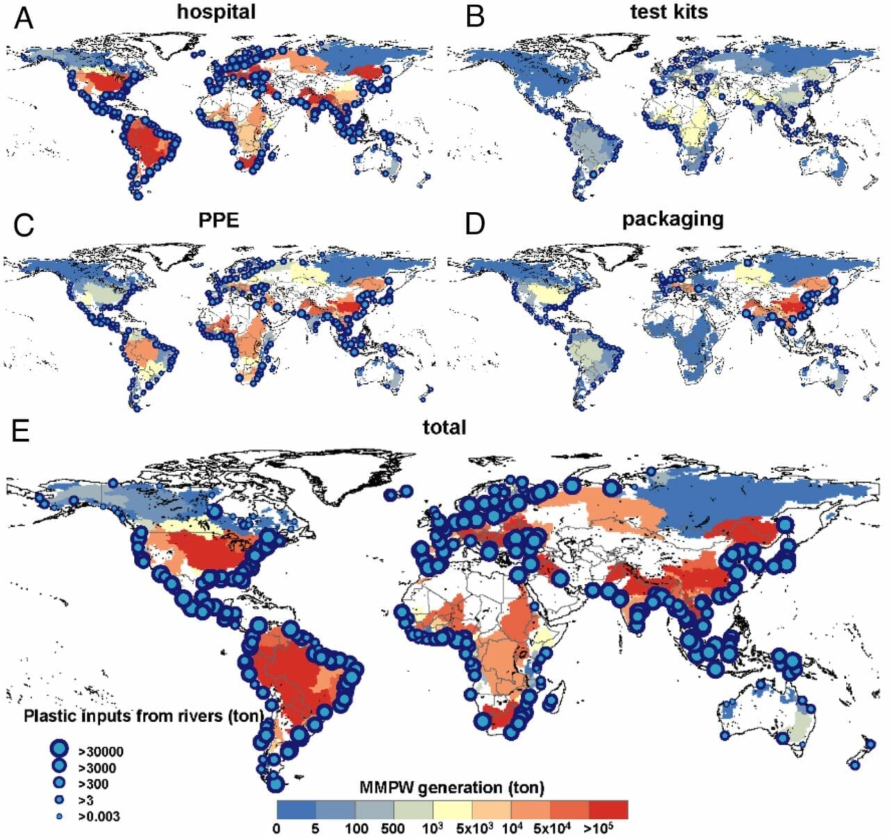 A diagram to show accumulated riverine discharge of pandemic-associated mismanaged plastics to the global ocean. Source: Peng et al. Plastic waste release caused by Covid-19 and its fate in the global ocean.