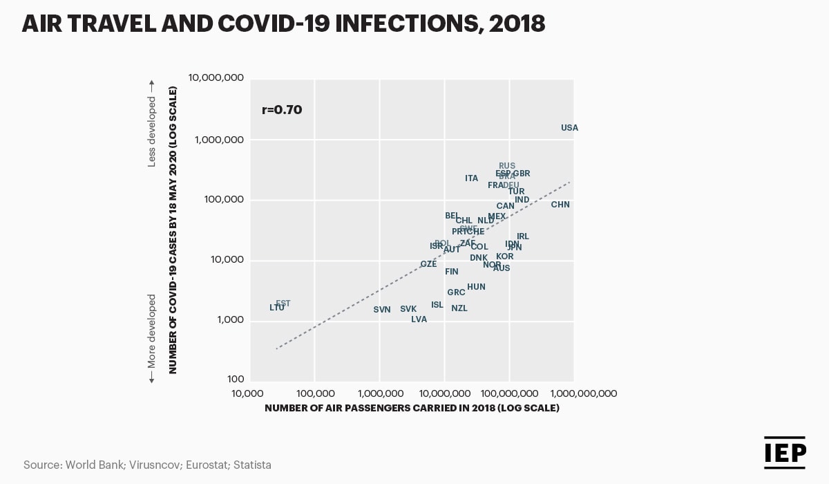 According to the report, prior to lock-down air travel was the socio-economic aspect most strongly associated with the amount of COVID-19 infections. The substantial amount of air traffic in France, Spain, Italy, UK and the US contributed to the high level of circulation of the virus among them. Since the pandemic spread all around the world, nations have instituted comprehensive travel controls to combat it.