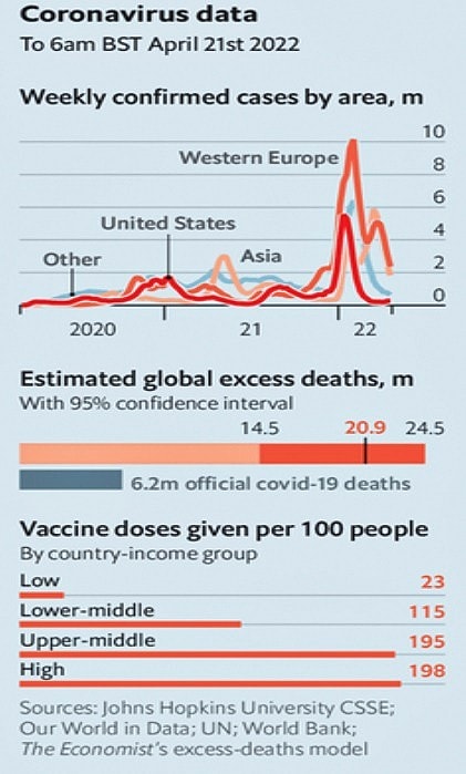 The Economist weekly publishes an unofficial “Excess Mortality,” estimate which is much, much higher, per the graph below from April 23, 2022 (U.S. Edition, screenshot):