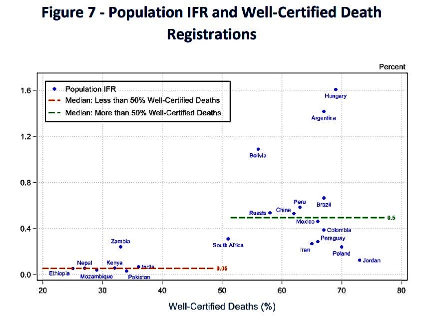 Indeed, when you compare the infection fatality rate (IFR) between places with decent death reporting systems and those without such systems in place before the pandemic, the death rate is about 10 times higher in places that report deaths adequately.