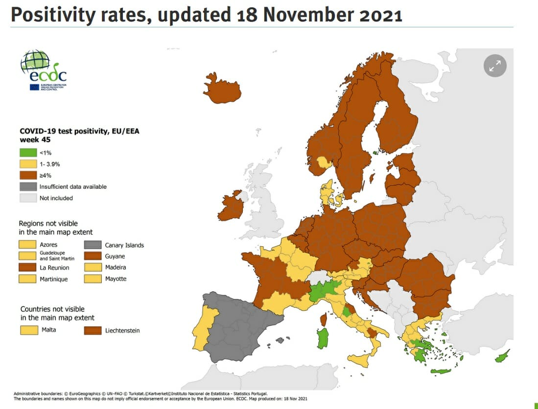 Overall, this map based on bi-weekly data (useful for traveling across the continent) shows how the situation looks as of November 18, 2021, according to the European Center for Disease Control and Prevention (ECDC).