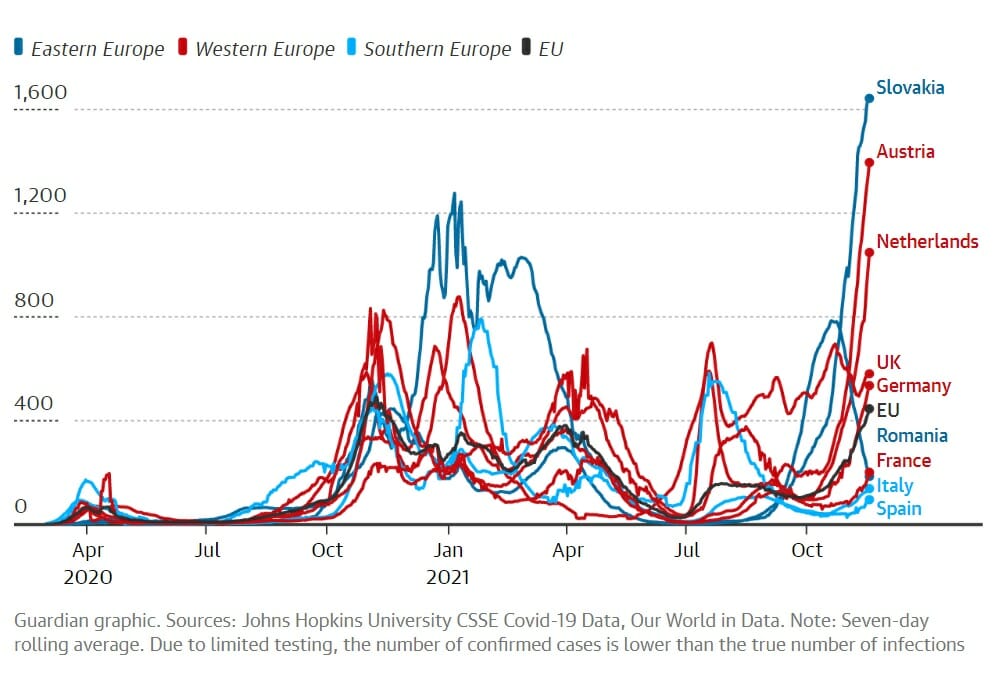 The UK., while not on this list, is not doing well. While Slovakia or Austria have worse figures, the UK has topped the EU average for months. The infection rate has climbed by about 15% over the past 10 days, from a base that since June has been consistently higher than the European average, as this graph from the UK Guardian shows: