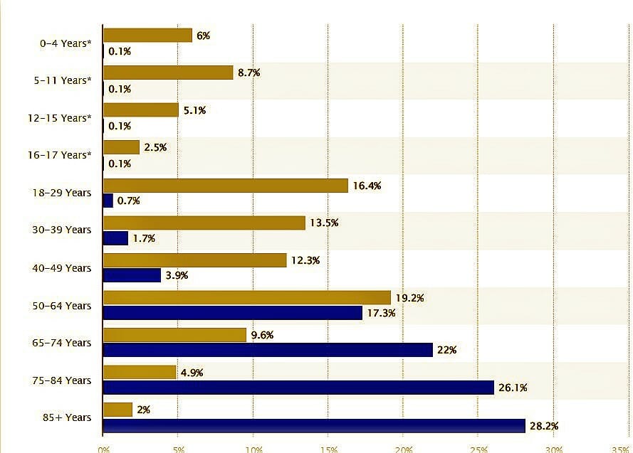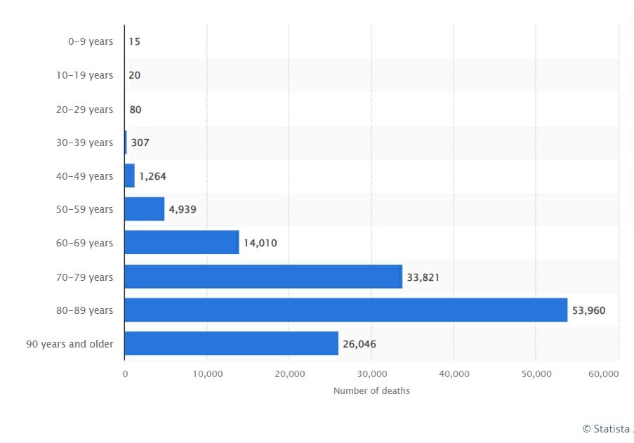 The above graph depicts the distribution of total COVID-19 deaths in the United States as of December 16, 2021, by age group. It shows, for example, that around 28.2 percent of total COVID-19 deaths in the United States have been among adults 85 years and older, despite this age group only accounting for 2 percent of the U.S. population.
