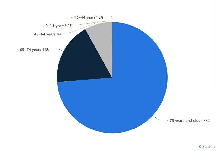 The above graph depicts the distribution of total COVID-19 deaths in the United States as of December 16, 2021, by age group. It shows, for example, that around 28.2 percent of total COVID-19 deaths in the United States have been among adults 85 years and older, despite this age group only accounting for 2 percent of the U.S. population.