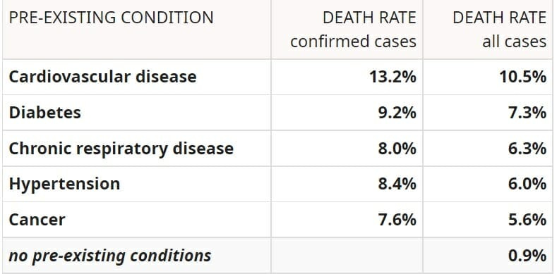 The percentages shown above do NOT represent in any way the share of deaths by a pre-existing condition. Rather, it represents, for a patient with a given pre-existing condition, the risk of dying if infected by COVID-19. With no pre-existing conditions, the patient’s risk is 0.9%; as the table shows, people with pre-existing cardiovascular disease are at the highest risk, with the confirmed death rate at 13.2%, and the others right behind, in descending order. Put another way, a person with a cardiovascular condition is roughly 10 to 13 times more likely to die from Covid than one without any pre-existing condition. This is a brutal statistic but one must remember that when facing specific cases, this is just a probability, not a certainty.