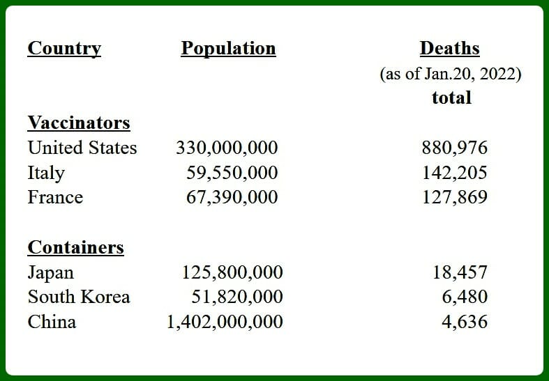 Other countries with over 300,000 deaths include Brazil, India, Russia, and Mexico. This includes some surprises but the overall picture remains valid so far: Containers have done markedly better than those pressing for vaccinations.