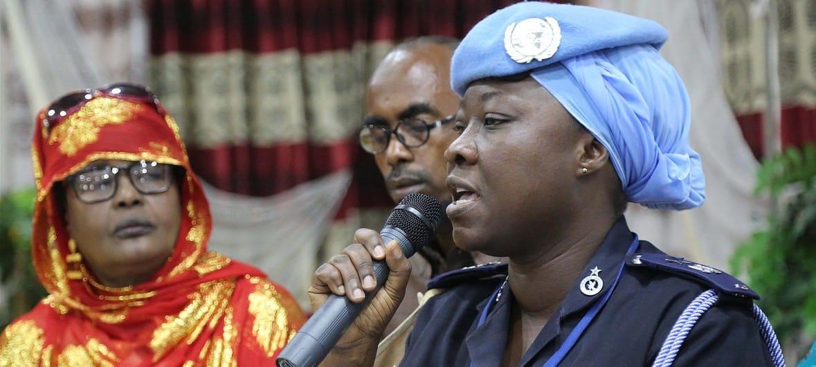 Featured Image: Phyllis Osei, UN Police advisor, speaks during the Women Peace Forum held in Kismaayo, Somalia on 25 July 2018. The forum was organized by the Somali National Women Association (SNWA) and supported by the United Nations Assistance Mission in Somalia (UNSOM) Source: News UN org