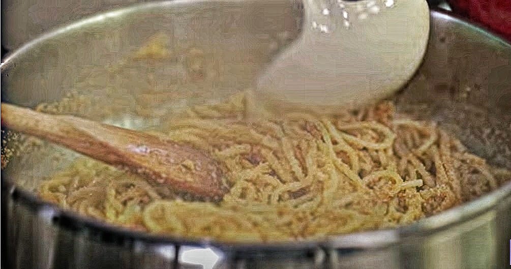 The trick to make it perfect: The reason why you don’t throw away the water in which you cooked the pasta is because a ladle or half-a-cup of that water will be needed when you stir-fry the pasta in your pan: That water is what makes the pasta sauce “come together” as a creamy sauce.