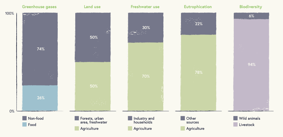 Food systems around the world are major contributors to climate change. The Intergovernmental Panel on Climate Change (IPCC) has reported that the global food system is responsible for an estimated 20-30% of total greenhouse gas emissions, occupies half the world’s habitable land, uses 70% of the freshwater we consume, causes three quarters of all water pollution, and is the single biggest contributor to biodiversity loss.