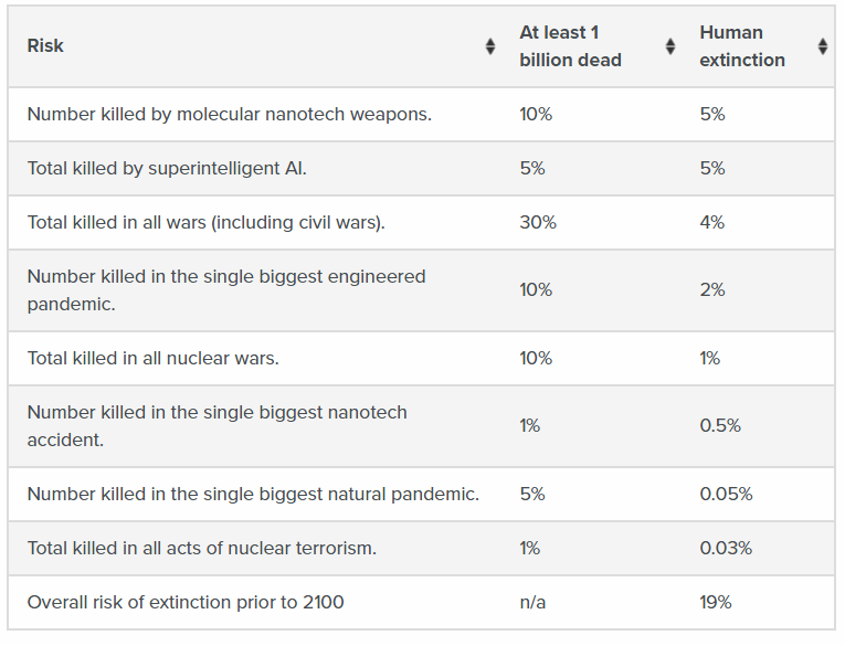 And it’s not just AI, in this table created at a conference in catastrophic risks Anders Sandberg and Nick Bostrom count up the existential risks that we face today. They count up to a 19% chance that we go extinct by 2100.