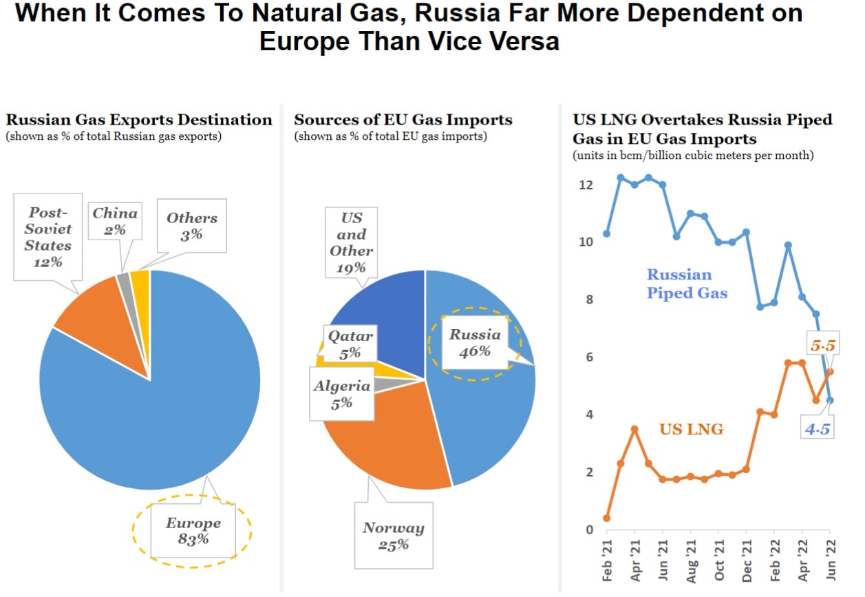 There is no question that sanctions are hurting Europe too, slowing the economy and hurting the green transition. As Stanley Reed reported in the New York Times, Europe is “on a knife’s edge” in its race to secure natural gas sources.