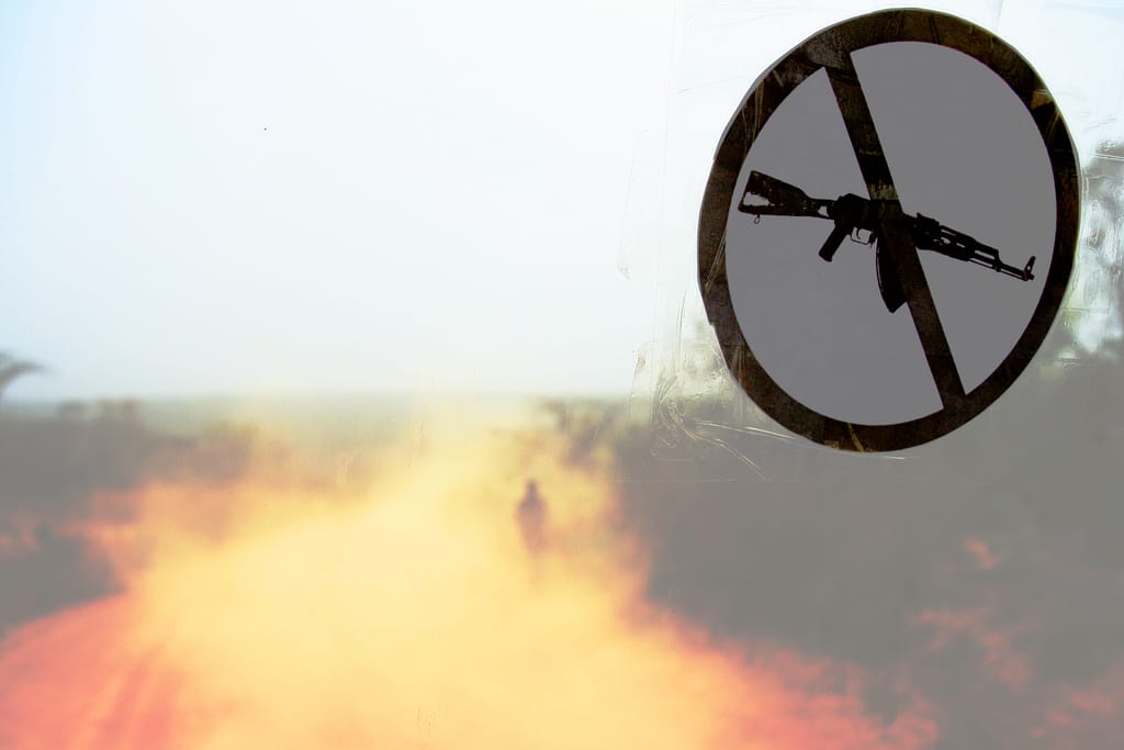 May 1990, on the road to Yalinga . A potholed dirt road , plunging straight forward, in the middle of nowhere, between Bangui and Yalinga, a small town lost in the south-east corner of Central Africa. Sheets of fire weave across the low, sunburned hills in long, narrow lines, fed by the yellowed savanna grass. The flames are broken now and then by broad, dried riverbeds and by the road itself. Tall termite mounds like gray sentinels on the wayside, rise above the fire, unscathed .