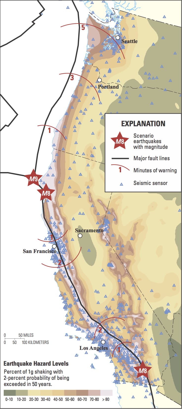 In the Photo: Map of the United States West Coast showing the advance warning time through early warning sensors that might be available from an early warning system for several plausible future earthquake scenarios. Featured here, a magnitude 8 (M8) quakes on the San Andreas Fault and an M9 quake on the Cascadia subduction zone. Photo credit: [Public domain], via Wikimedia Commons