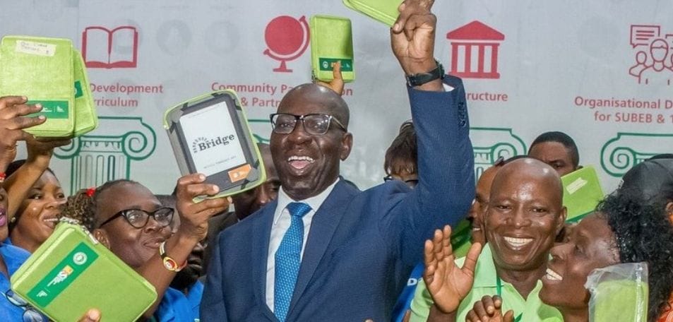 In the photo: Edo State Governor Obaseki celebrating the Bridge Teacher Guides that underpins EdoBEST teacher training and classroom technology Photo credit: Bridge