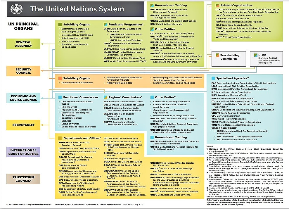 Further, UN humanitarian agencies are assisting over one billion people with essential survival needs. In total, some 80 related agencies, organizations, subsidiary bodies, programmes and independent offices are currently part of the UN system, as shown in the UN system chart below: