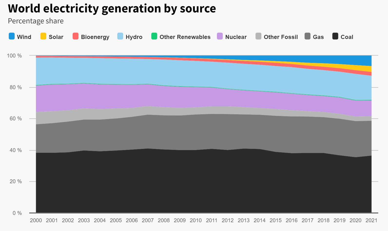 For the first time, the two main variable renewable energy sources – solar and wind – generated more than 10% of electricity globally in 2021. Albeit good news, this is still far from what we need: the IEA says we should target 70% for 2050, IRENA 63%.