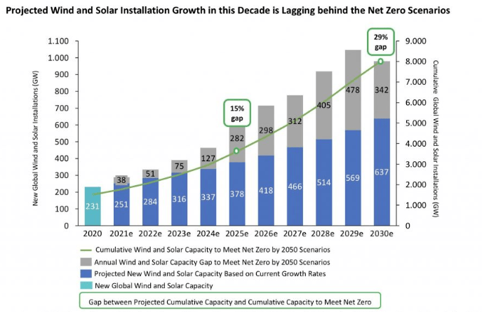 Yet, despite the remarkable growth rates, a joint study by the Global Solar Council and the Global Wind Energy Council found that there will be a 29% shortfall in the projected wind and solar capacity required in this decade to keep the world on a net-zero pathway.