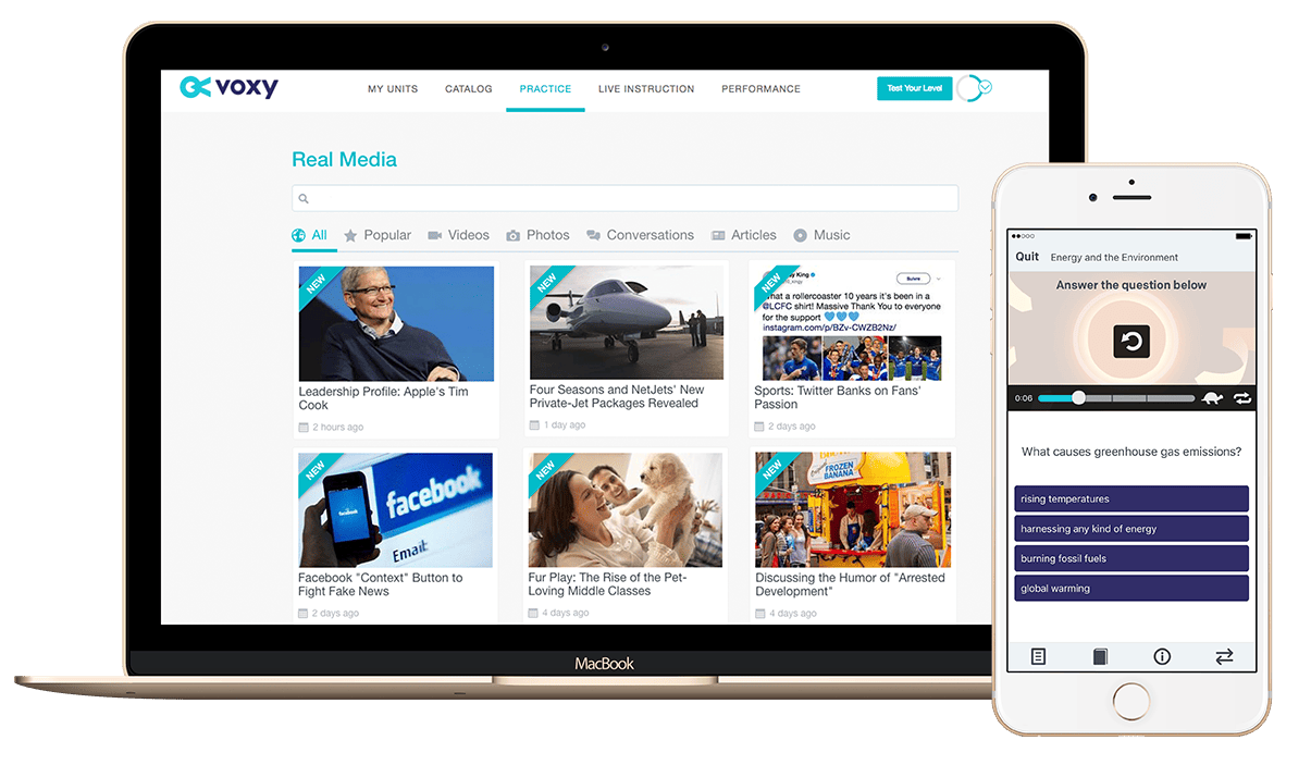 One of the things that our chief education officer, Katie Nielson, points out is that most schools’ approach to teaching second languages is much more similar to how they would teach any content area, like biology, chemistry or world history. But that is actually not very appropriate when learning a language. Learning a language is much more like learning a skill than it is a specific content area. So, we at Voxy think about learning English, or any second language, more like learning how to cook, how to surf, or learning how to shoot a free throw in basketball, starkly contrasting the typical ‘Week one – tenses. Week two – family members’ approach. Learning a language is learning a skill, and needs to be tied very closely with the real world tasks that you’re trying to accomplish.