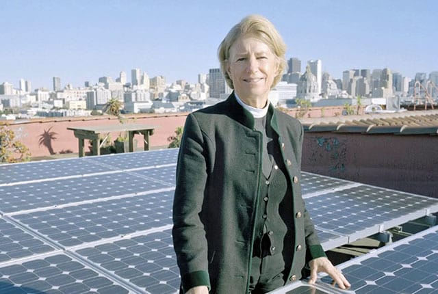 In The Photo: Environmentalist Reverend Canon Sally Bingham with Rooftop Solar Panels. Photo Credit: Ohio Interfaith Power & Light – Original