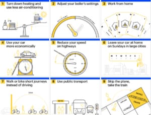 The recommended efforts include turning down the heat and using less air conditioning, working from home when possible to avoid driving, carpooling and using public transportation.