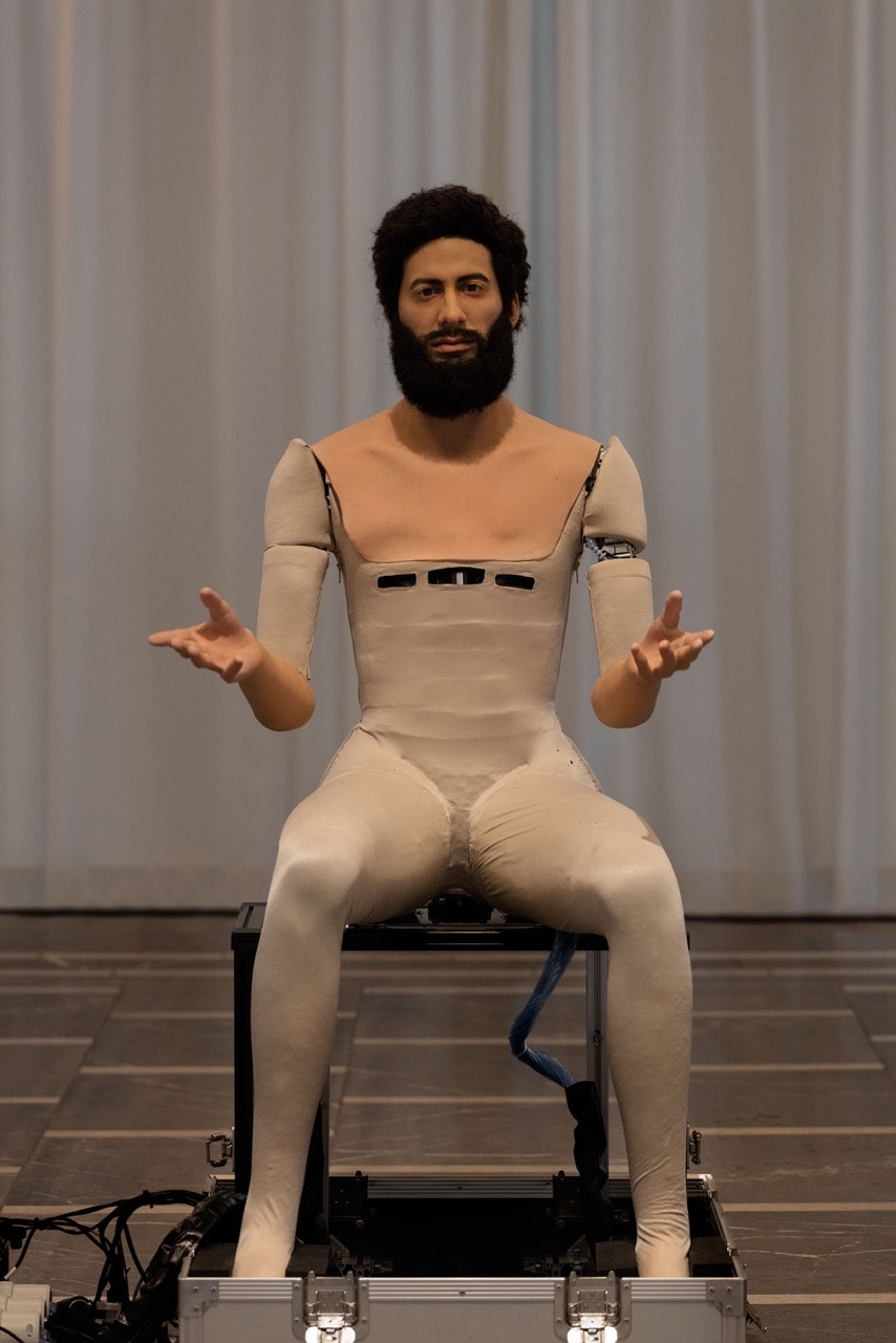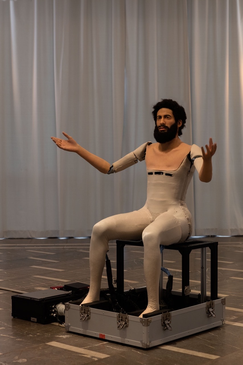 “To the son of the man who ate the scroll” is the second part of Macuga’s double-exhibition first set up for the Fondazione Prada in Milan and currently on show at the Schinkel’s Pavillon. The viewer enters the space and is confronted with a male-looking, long-bearded robot that’s sitting in the middle of an octagonal space. The android (commissioned from the Japanese firm A lab) is talking about humanity, about its beginning and its end. The title itself refers to a passage in the Book of Revelations (10:9) in which the prophet Ezekiel is asked to digest the word of God by eating a scroll. He speaks the words of philosophers, writers, filmmakers, theorists and politicians. He is an anthropophagist (from the Greek meaning “people-eater”) chewing and swallowing all of human history.