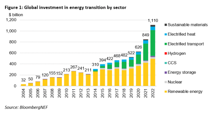According to the 2023 edition, the $1.1 trillion invested in the energy transition in 2022 represents a new record and is far higher – 31% to be precise – than the 2021 investments, which totaled $775 billion.