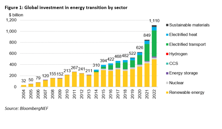 Except for one, all low-carbon energy sectors covered in the BNEF report have broken investment records in 2022.