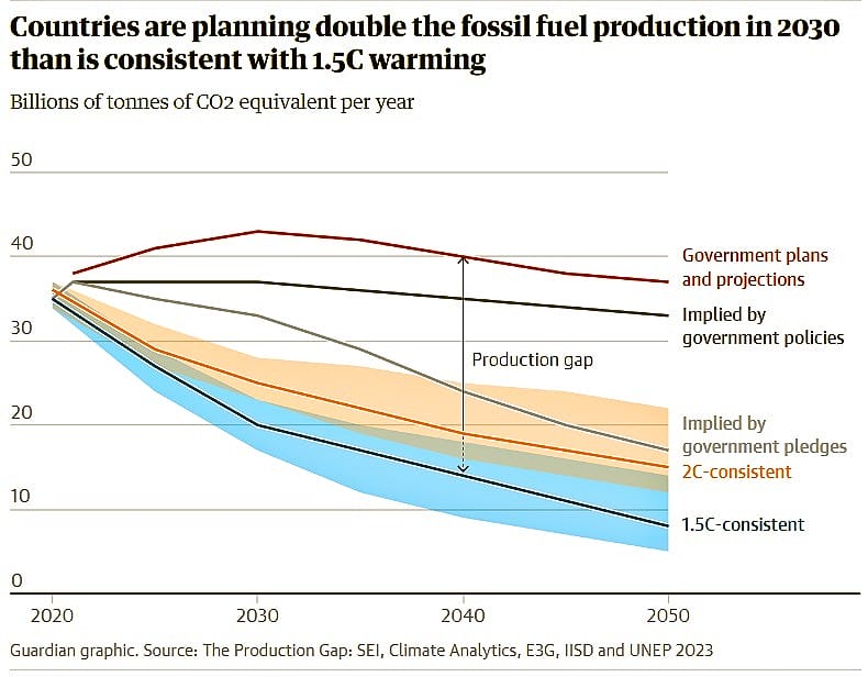 “Governments are literally doubling down on fossil fuel production,’ said Antònio Guterres, the UN secretary-general, last week when a new UN report came out analyzing the expansion plans of fossil fuels producers. “That spells double trouble for people and planet’, he added, concluding grimly, ‘Fossil fuels are sending essential climate goals up in smoke.” (bolding added)