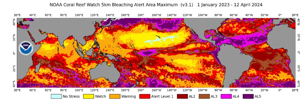 Mass bleaching of coral reefs since early 2023 (Figure 1) has been confirmed in over 50 countries, territories, and local economies, including Florida (US), the Caribbean, the Eastern Tropical Pacific (including Mexico, El Salvador, Costa Rica, Panama, and Colombia), Australia’s Great Barrier Reef, large areas of the South Pacific (including Fiji, Vanuatu, Tuvalu, Kiribati, and the Samoas), the Red Sea (including the Gulf of Aqaba), the Persian Gulf, and the Gulf of Aden. Reports have also been confirmed of widespread bleaching across parts of the Western Indian Ocean, including Tanzania, Kenya, Mauritius, Seychelles, Tromelin, Mayotte, and off the western coast of Indonesia.