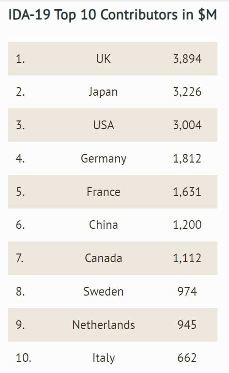 Note that the US used to be a top contributor, reaching its highest point with the Obama administration when it contributed around $3.9 billion. Final figures for IDA20 are not yet available.