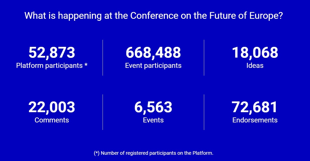 This is a much better result than what had been foreseen just a few months ago, in November 2021 when the Conference was seen as “faltering” due to lack of participation. At that point, only 7,115 ideas and 2,079 events were inserted on the platform. The “lukewarm participation” was attributed to the lack of political investment on the Conference by political representatives and governments throughout Europe. And of course, Covid lockdown measures didn’t help.