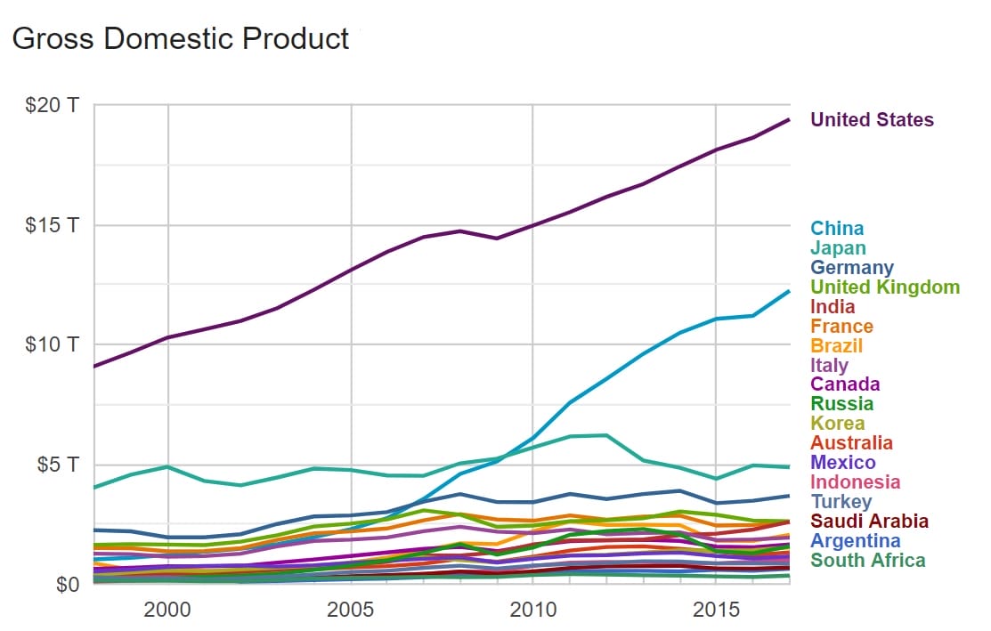 In the diagram: Evolution of G20 Member countries Gross Domestic Product since foundation of G20 (1999) Source: Data from World Bank Last updated: Jul 6, 2018 ©2014 Google
