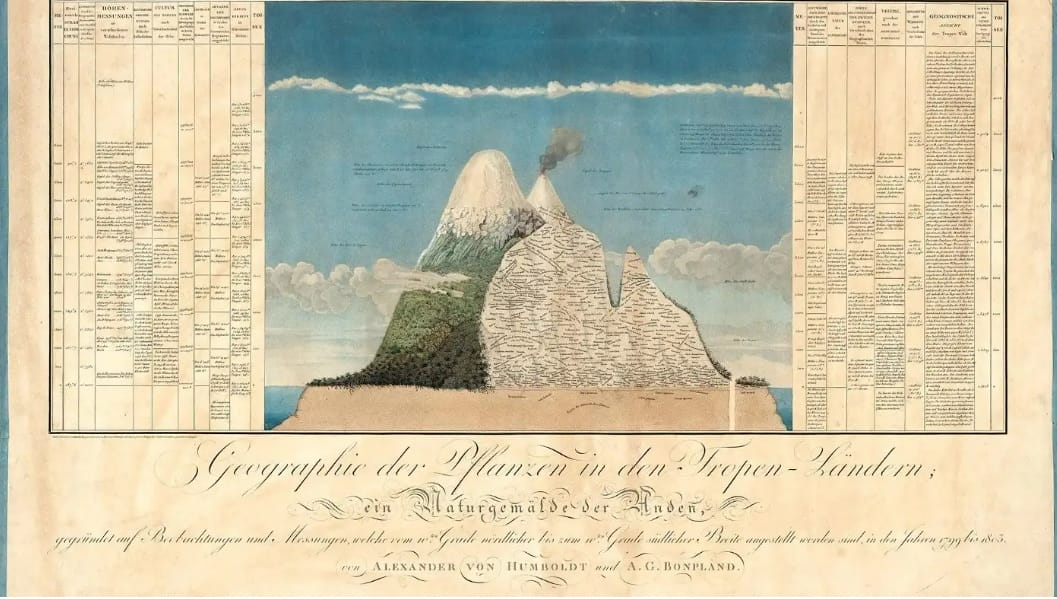 The Chimborazo, which happens to be the mountain with the closest elevation to the sun from the earth’s core, drew Humboldt’ attention and the scientists put together all the data they gathered about temperature, elevation, fertility, land use, vegetation, fauna etc, into a folio, known as the Naturgemälde. This remarkable graphic document is considered today history’s first infographic, putting scientific information into images: