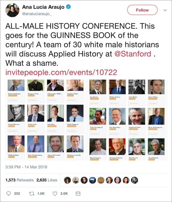 There are also studies that report on all-male conference panels, on the overlooking and exclusion of women at conferences, and on sexual harassment and advances women often face during academic conferences. While these stories are receiving more publicity now than in the past, the abundance of such stories highlights how male-only panels have very much been an academic norm, which has not undergone much scrutiny until quite recently.