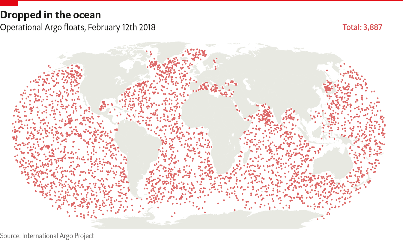 In early 2018 the Economist published a technology quarterly report on the way technology transforms our relationship with the ocean. Argos floats are deep water drones that dive to a depth of 2 km, taking measurements of ocean currents, temperature, and nutrients along the way before popping back up to transmit the data. There are currently more than 4,000 of those.