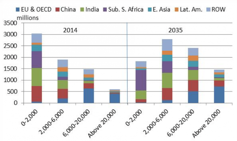In photo: Number of people worldwide by income bracket. The chart reports the number of individuals worldwide as well as their regional distribution, for each of four groups defined by the ranges shown in terms of absolute annual household per capita incomes expressed in 2011 international U.S. dollars (which correct for cross-country differences in purchasing power). The chart shows the situation in 2014 and the projection to 2035 under the authors’ baseline scenario.