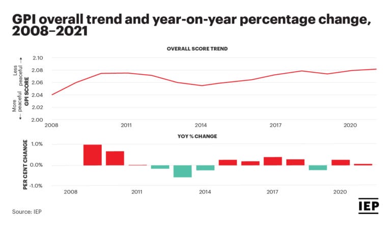 Editor’s Note: The opinions expressed here by Impakter.com columnists or contributors are their own, not those of Impakter.com. — In the Featured Photo: A snapshot of the global state of peace, 2021. Featured Photo Credit: Institute for Economics and Peace.