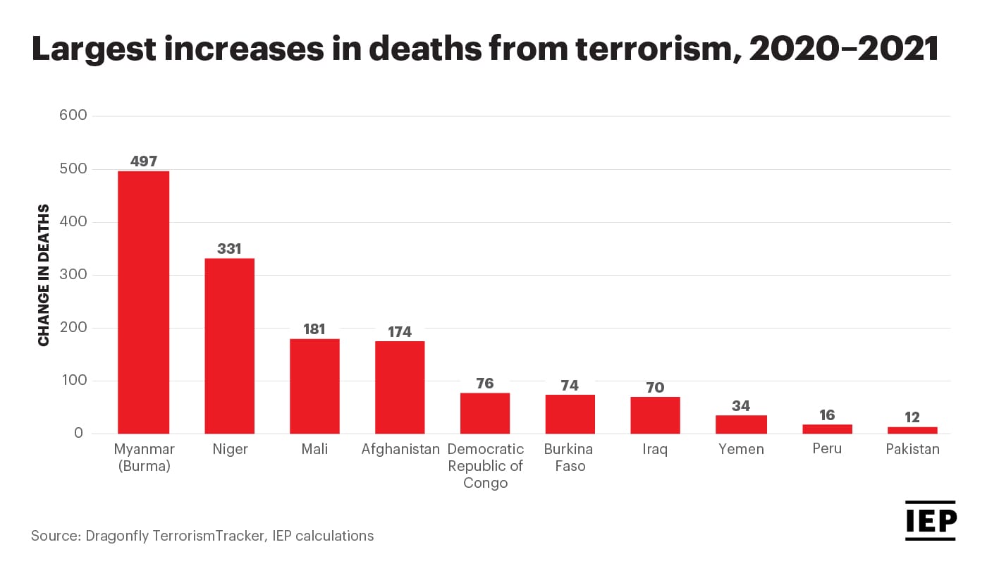 Nearly half of all terrorism deaths globally (48 percent or 3,461deaths) occurred in Sub-Saharan Africa. Four of the ten countries with the largest increases in deaths from terrorism were Burkina Faso, the Democratic Republic of the Congo, Mali, and Niger, all of which are fragile states scoring very low on the Positive Peace Index. Fragile states are characterized by a lack of social and economic resilience to outside shocks, as state institutions are often new and poorly grounded in local society and communities often have not yet formed their own associations.