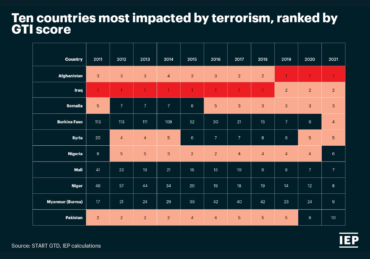 The Global Terrorism Index (GTI) is a comprehensive study analysing the impact of terrorism for 163 countries covering 99.7% of the world’s population. The GTI report is produced by the Institute for Economics & Peace (IEP) using data from Terrorism Tracker and other sources. To read the full report, click here.