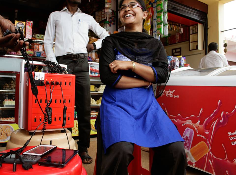 In the photo: Meet Anita, one of our new agents. Anita is a true entrepreneur. In her village, she owns and manages three local stores, one banking outlet and now one BuffaloGrid mobile power hub. Our team took this picture while visiting one of her stores in Konunduru, a village in rural Karnataka, India – Credit: BuffaloGrid