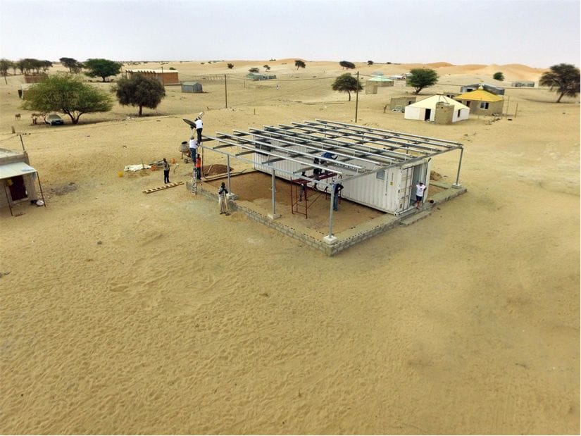 The product is essentially a shipping container which unfolds a scaffold, placing solar panels above, and an internet connection. It is designed to travel on the back of a lorry, and be unpacked in only a couple of days.
