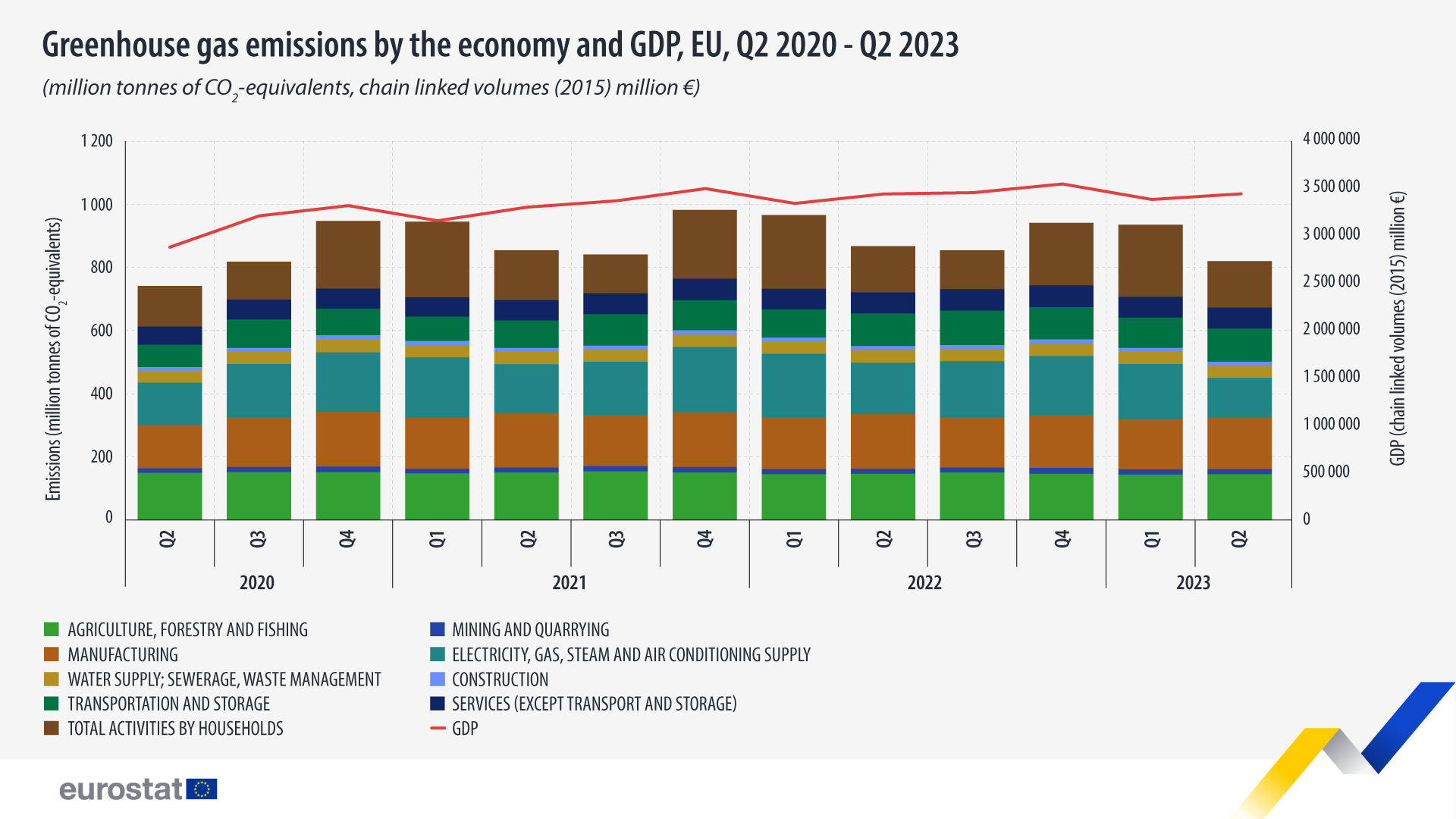 Eurostat’s quarterly estimates for greenhouse gas emissions by economic activity provide valuable insights into the environmental progress of EU member states. Below are some of Eurostat’s key findings.